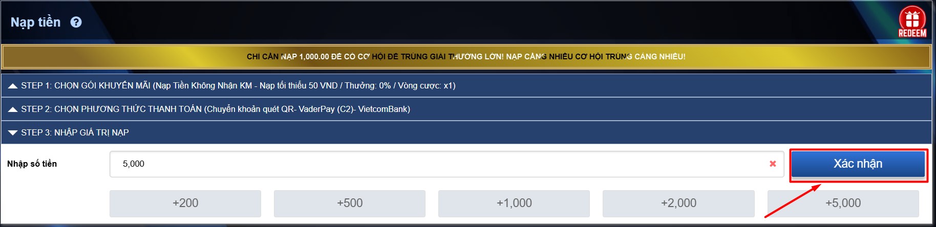 Bước 3: Nhập số tiền cần nạp. Lưu ý, điểm sẽ được quy đổi nên ví dụ quý khách nạp số tiền 5.000.000 VNĐ thì nhập 5000. Sau đó ấn "Xác Nhận".
